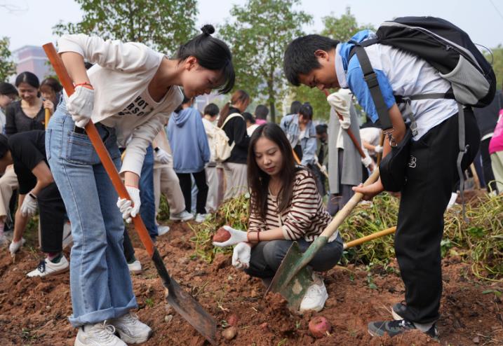 “虽然很累,但看着满满一袋,都是我们自己的劳动成果心里就高兴。这次劳动实践课让我第一次见到了红薯长在地里是什么样的,第一次知道红薯应该怎么挖。”2023级中国语言文学类专业学生曾婉莹说,她告诉记者,在这次活动中,她体会到了劳动的成就感,非常期待下一节实践课。
