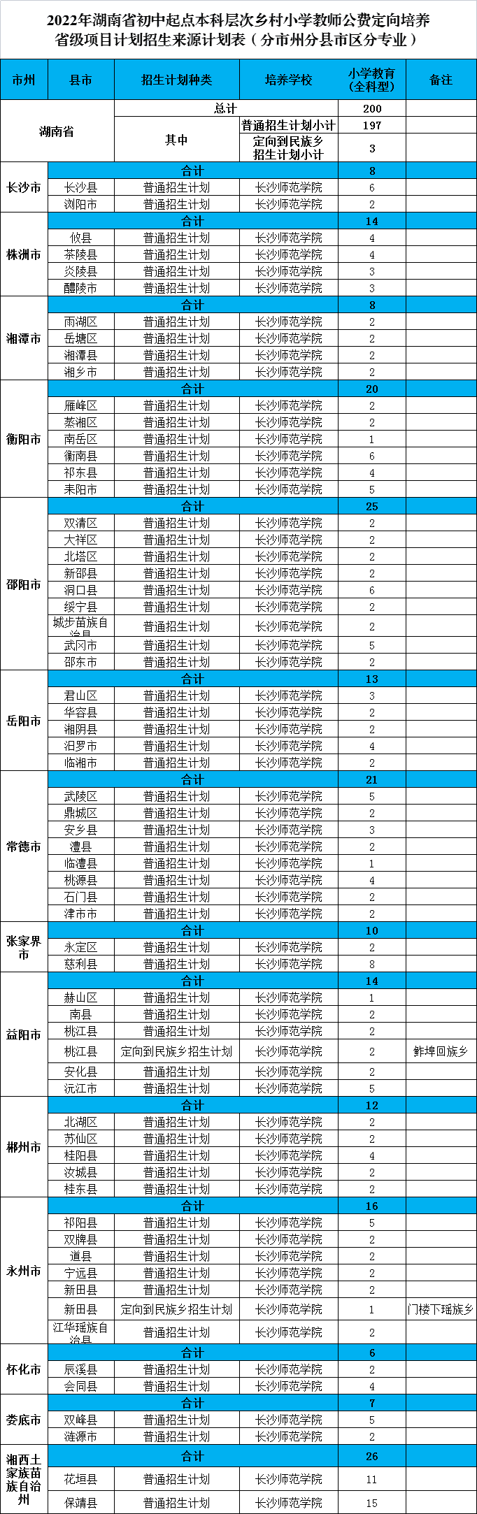 详见湖南省教育厅《关于做好2022年初中起点乡村教师公费定向培养计划招生工作的通知》(湘教通〔2022〕99号)。