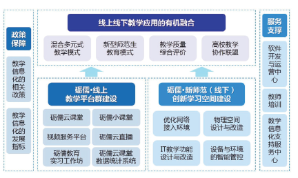在信息化教学环境支撑下,学校大力推动线上线下混合式教学活动的开展和教学应用模式的创新,包括混合多元式教学模式、新型师范生教育模式、教学质量的综合评价和促进高校间教学协作,逐步实现信息化教学的规模化与常态化。