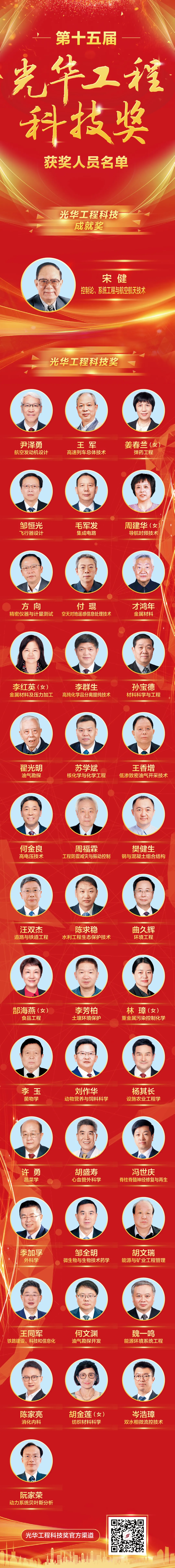 6月25日,第十五届光华工程科技奖获奖人员名单在中国工程院第十七次院士大会上公布。中国科学院院士、中国工程院院士、控制论、系统工程与航空航天技术专家宋健获得光华工程科技成就奖;另有航空发动机设计专家尹泽勇、高速列车总体技术专家王军、弹药工程专家姜春兰等40位专家因在各自领域取得突出成绩而荣膺光华工程科技奖。