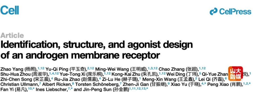 1月30日,山东大学基础医学院孙金鹏教授团队,联合德国莱比锡大学Ines Liebscher教授团队,山东大学易凡教授团队、肖鹏教授团队和于晓教授团队,在《细胞》(Cell)在线发表了研究论文“Identification, structure and agonist design of an androgen membrane receptor”。研究团队筛选鉴定了雄激素5α-DHT的膜受体GPR133/ADGRD1,阐明了其在骨骼肌中的调控作用及分子机制,并发展了特异性GPR133的小分子配体,为高效安全的雄激素替代药物开发提供了全新思路。