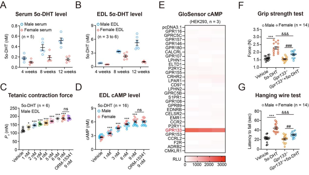 DHT是人体内作用最强的雄激素,不仅决定性器官的发育和第二性征的形成(如体毛、声音变化等),还广泛参与人体能量代谢、免疫系统调节、大脑功能以及某些疾病(如肿瘤)的发生发展。研究发现,DHT可能通过细胞膜上的某种特殊受体起作用。骨骼肌中的一种名为GPR133的蛋白质是DHT的膜受体。当这个受体被敲除后,小鼠对DHT增强肌肉收缩力的反应显著减弱。这表明,GPR133是DHT快速作用的重要开关。