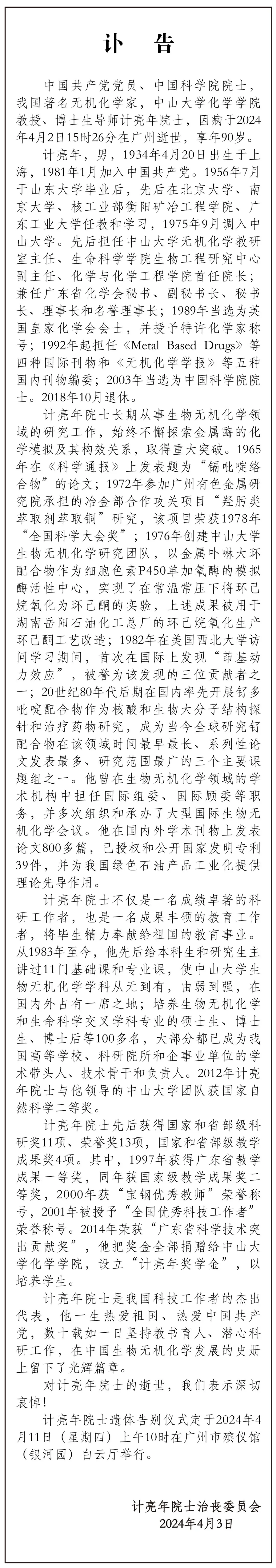 4月4日,中山大学官方微信号发布讣告:中国共产党党员、中国科学院院士,我国著名无机化学家,中山大学化学学院教授、博士生导师计亮年院士,因病于2024年4月2日15时26分在广州逝世,享年90岁。
