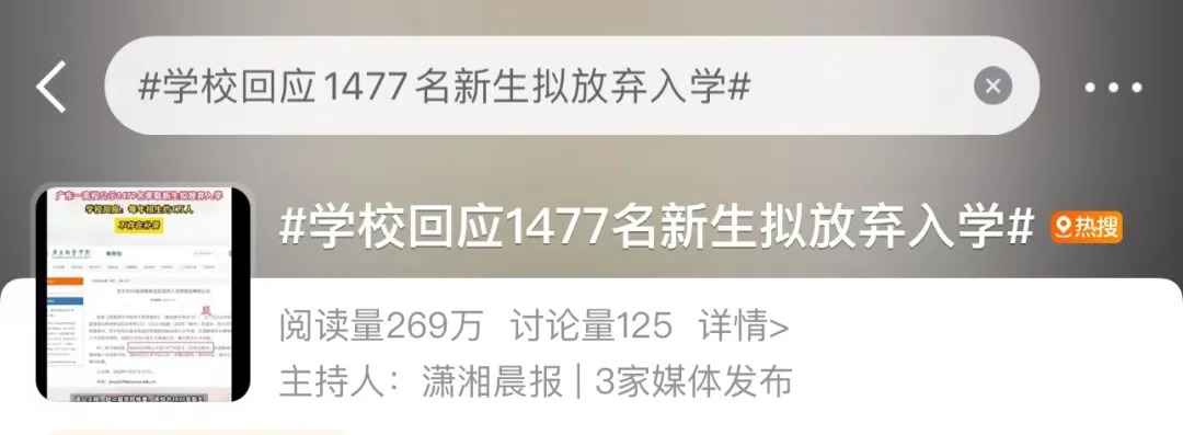 近日,广东某高校公示1447名新生未报到的消息冲上热搜。面对各方舆论,学校不得不发出澄清声明,强调了两点,第一,公示不报到新生是规定动作,其中有709人是专升本学生,非传统意义上的普通高考录取学生,一些甚至已经参加工作;第二,总报到率在90%左右,和其他高校相比属于正常范围。