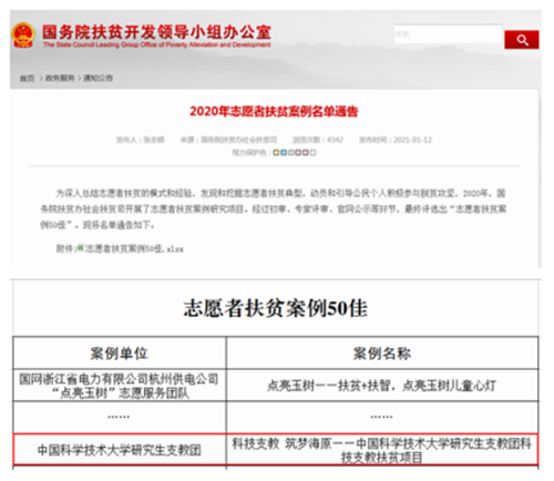 1月12日,国务院扶贫办社会扶贫司发布2020年志愿者扶贫案例名单通告,公布了“志愿者扶贫案例50佳”名单。中国科技大学“科技支教 筑梦海原——中国科学技术大学研究生支教团科技支教扶贫”项目成功入选。