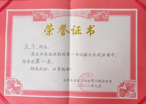 日前,在五河县委举办的选派驻村第一书记擂台比武大赛中,蚌埠医学院选派干部、驻五河县大新镇郭府村党总支第一书记凌浩同志经过激烈角逐,荣获第一名佳绩。