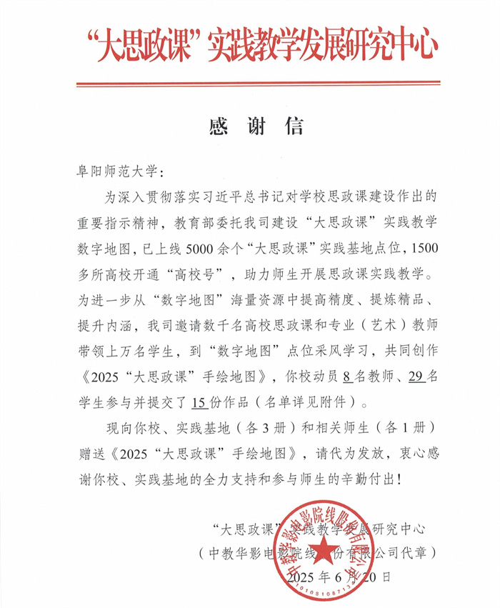 “行走的思政课”是阜阳师范大学打造的特色思政品牌,通过“实地调研+红色研学+社会服务”的沉浸式教学模式,引导学生深入革命老区、乡村振兴一线、改革开放前沿等地,将思政小课堂与社会大课堂紧密结合。项目以“手绘地图”为载体,生动呈现思政实践路线与育人成果,让思政教育可触、可感、可传播。下一步,将在思政课改革创新上持续深耕,用好地方优质育人资源,将革命纪念馆、博物馆、革命烈士故居等区域红色资源纳入思政课教学实践基地,通过“行走的思政课”等新范式新载体,展现新时代思政课新气象,进而为培养更多有理想、敢担当、能吃苦、肯奋斗的时代新人贡献力量。 (作者:赵晨阳)