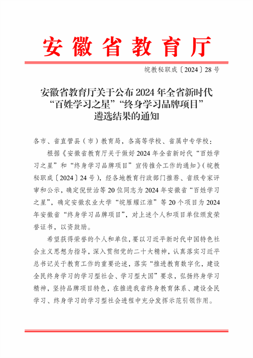 近日,安徽省教育厅下发通知,公布2024年全省新时代“百姓学习之星”“终身学习品牌项目”名单,安徽农业大学乡村振兴学院、继续教育学院申报的“皖雁耀江淮—乡村产业振兴带头人‘头雁’培育”项目获评2024年全省“终身学习品牌项目”。