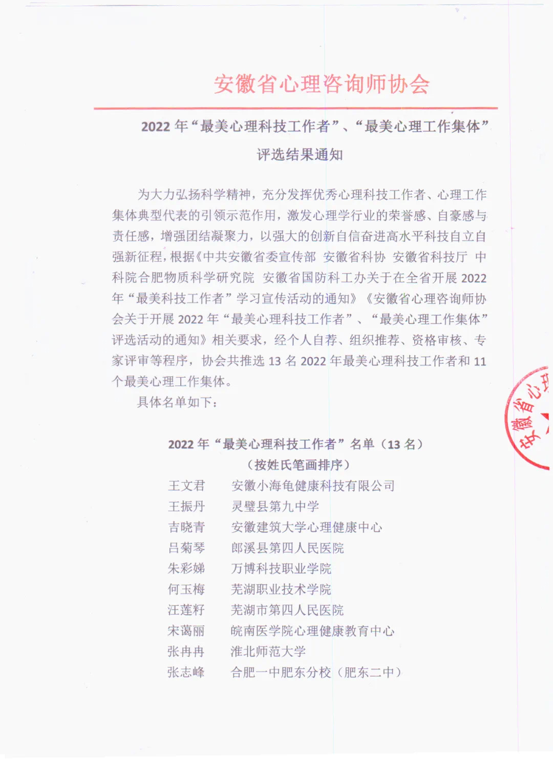 据悉,此次评选活动是为大力弘扬科学精神,充分发挥优秀心理科技工作者、心理工作集体典型代表的引领示范作用,激发心理学行业的荣誉感、自豪感与责任感。根据《中共安徽省委宣传部安徽省科协安徽省科技厅中科院合肥物质科学研究院安徽省国防科工办关于在全省开展2022年“最美科技工作者”学习宣传活动的通知》和《安徽省心理咨询师协会关于开展2022年“最美心理科技工作者”、“最美心理工作集体”评选活动的通知》而开展。
