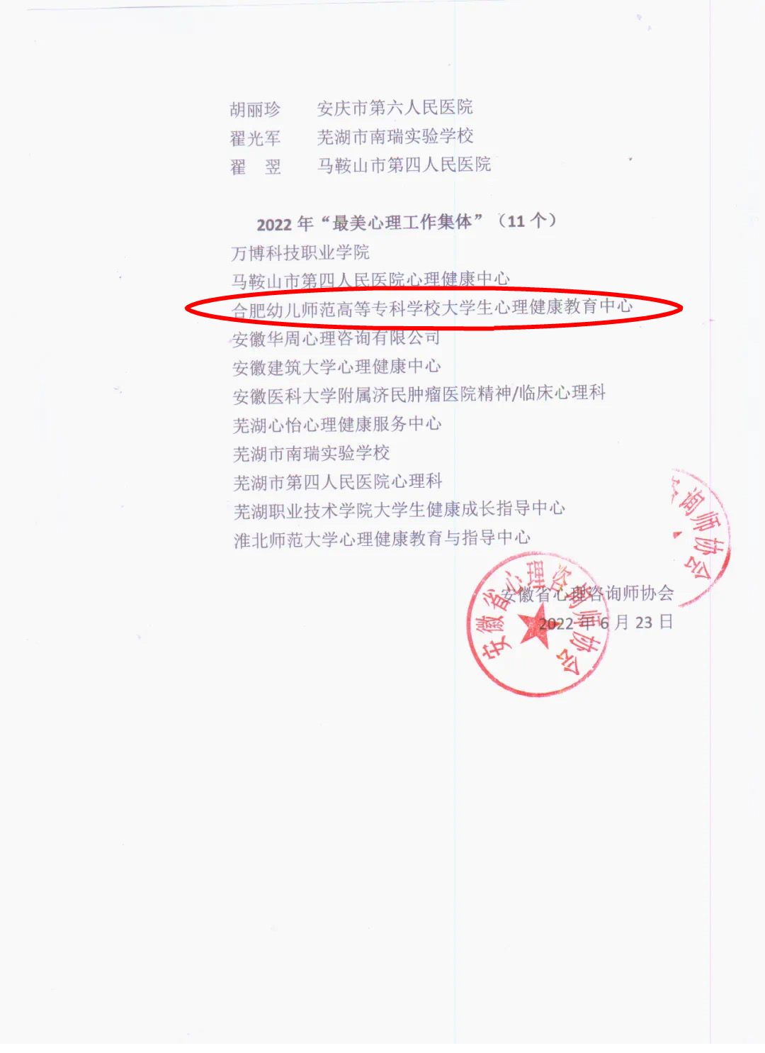 近日,安徽省心理咨询师协会公布了2022年“最美心理工作集体”评选结果。合肥幼儿师范高等专科学校大学生心理健康教育中心入选。