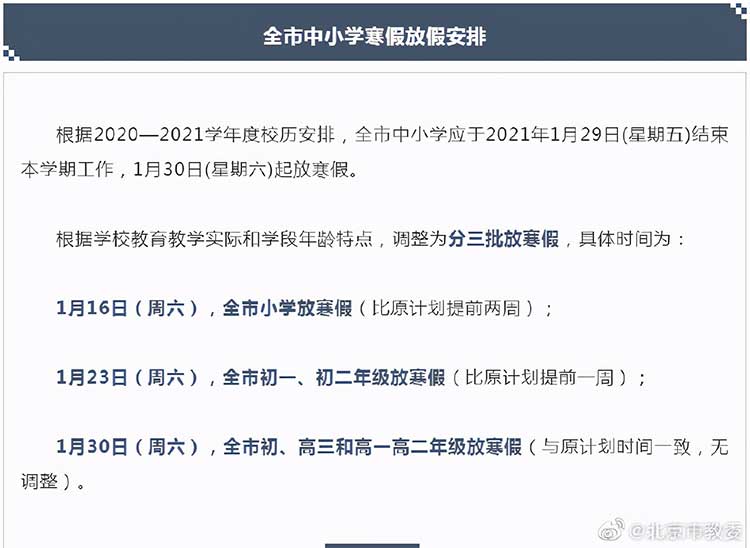 北京市中小学寒假放假时间调整 小学比原计划提前两周