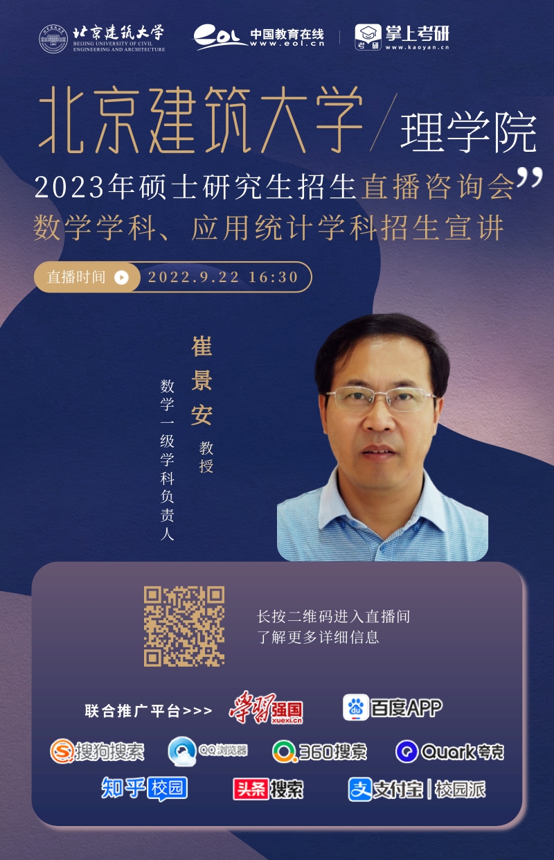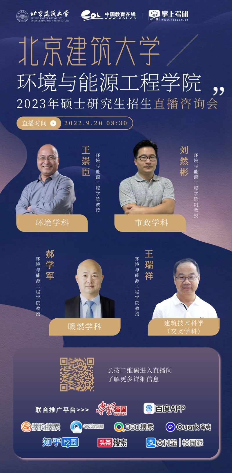 北京建筑大学2023年硕士研究生招生直播咨询会,将于9月19日拉开序幕,锁定金宝搏188入口 “掌上考研”、学习强国、抖音等平台,带您沉浸式了解北京建筑大学2023年硕士研究生招生详情,不见不散!