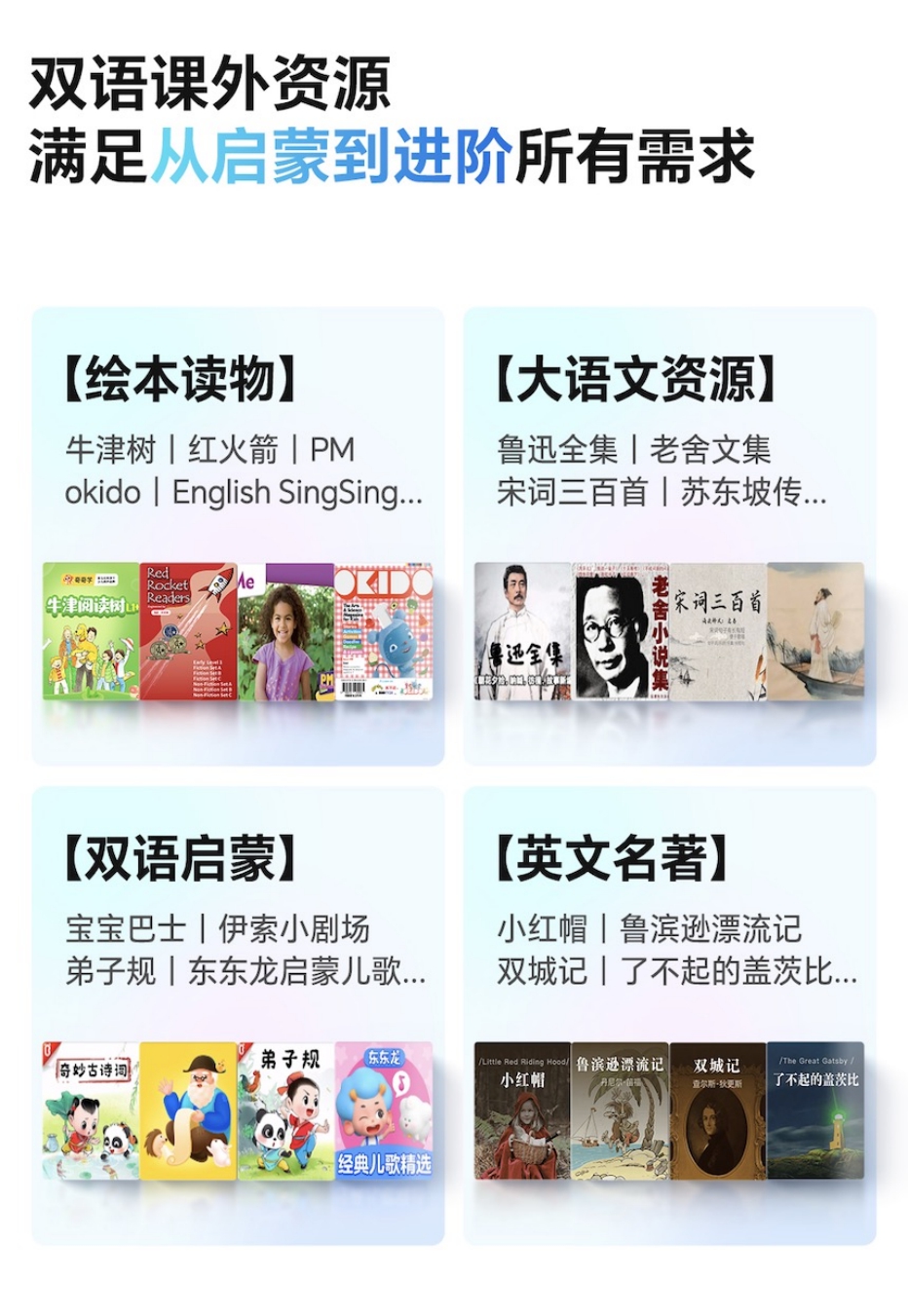 为更好地贴合“新课标”对英语学习的新需求,有道听力宝E6 Pro集成了超35,000个课内外双语资源、1,000余套独家资源,同时内置海量分级阅读,如《牛津树》、《红火箭》、鲁迅全集、鲁滨逊漂流记、PM系列分级听力材料、OKIDO学前益智杂志……实现校内教材同步练习到课外资源的全面覆盖,满足不同年龄段和学习水平的需求。更重要的是,有道听力宝E6 Pro充分支持学习者利用碎片时间进行分级阅读的需求,让孩子随时随地练听力、学口语。