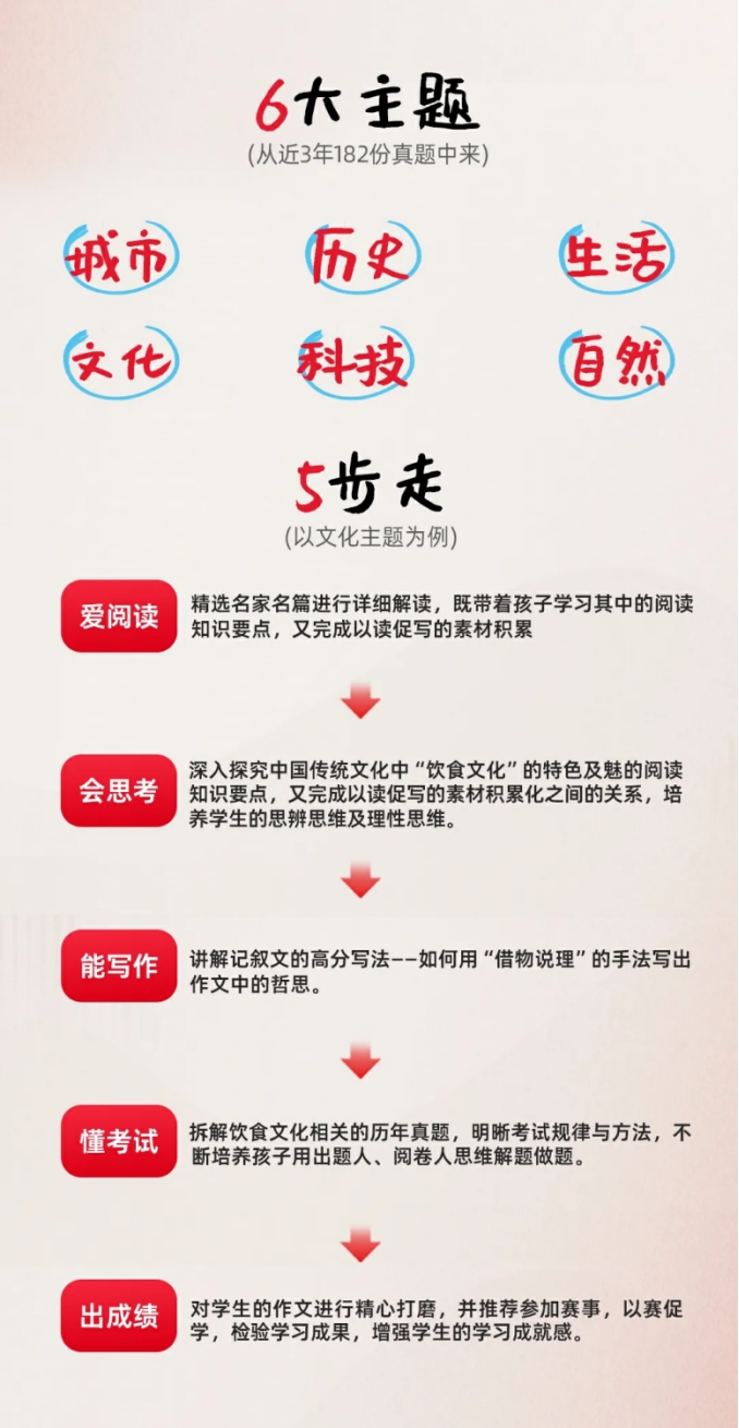 其中,“6 大主题” 源自有道博闻教学教研负责人郭路萍团队对近 3 年 182 份中考试卷的深入分析,归纳出城市、历史、文化、科技、自然、生活这 6 大必考主题,引导孩子通过 “爱阅读、会思考、能写作、懂考试、出成绩” 的 “5 步走” 学习路径,使学习紧密贴合考试需求,避免学考脱节。
