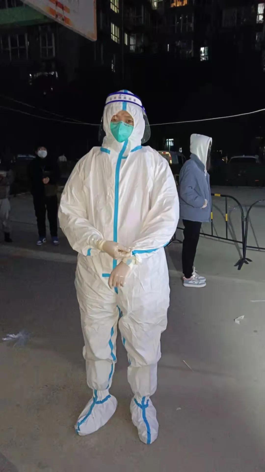 隔离刚开始的时候整个小区的个别群众陷入了恐慌中,跑下楼要强行闯出,少数群众出现焦虑在楼道走来走去,志愿者见状一一劝他们回家。姜聪住的这个小区有两栋楼,约3000住户,每天都有大量生活物资堆在小区的门口等待进行消杀后分拣送达。姜聪积极协助医护人员一户一户的做核酸,做完核酸后一遍一遍的对每一层楼进行消杀,同时还要马不停蹄的分拣配送物资。在电话交流中,姜聪谈到自己的体验,“第一次感受到防护服是真的热,感受到医护人员的辛苦,戴着口罩和防护面罩稍微跑动一下就闷的喘不上气,汗水顺着头发丝流进脖子里,脱下防护服是真的酸爽,夹杂着浓郁的汗臭味,防护面具下的头发紧紧贴在头皮上,脸上全是勒痕。全天不敢喝水不敢多吃就怕去厕所,一套防护服是80元,真的不能浪费。第一天下来,深感医护人员的辛苦,对医护人员更多了一份钦佩和尊重。”
