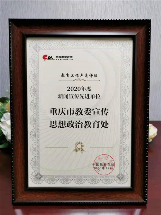 本次公布的“2020年度新闻宣传先进单位奖”榜单中,重庆市教委宣传思想政治教育处在2020年度教育新闻宣传工作方面表现突出,被授予“新闻宣传先进单位”荣誉称号。