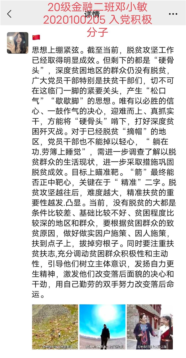 汲取脱贫之智,讲好中国故事。通过开展“汲取脱贫之智,讲好中国故事”党性教育活动,让学生党员和入党积极分子们跟随着《无穷之路》的主持人穿越崇山峻岭、戈壁沙漠,了解了一个个鲜活的人物与饱含真情的故事,感受着这片土地因为扶贫政策所产生的翻天覆地的变化,体会到国家的“精准扶贫,科学扶贫”政策真正内涵。参与本次活动的学生党员、入党积极分子共190名,共收集微信朋友圈感想截图358份。