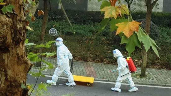 徐江发说,穿着隔离服走路,就像是“走在雾里”,面罩上是雾蒙蒙的,身上是汗涔涔的,传来的声音也是模模糊糊的,往往一天就得换上三次衣物。为了加快工作效率,后勤保障组经历了数次培训,已经形成了“流水线”式的工作方式,消毒时大家分头行动,肩背消毒壶,手提喷洒器,全方位做好校园清洁消杀,收垃圾时便两人合作,一人提袋,一人反复偻腰拾起垃圾。“连手都在出汗,但汗被手套裹着。”徐江发说,“有时候工作完,手的皮肤都被汗液浸白了。”