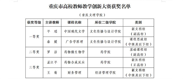近日,重庆市教委发布《关于公布2023年重庆市高校教师教学创新大赛获奖名单的通知》,重庆文理学院教师共获得一等奖2项、二等奖1项、三等奖2项,学校获优秀组织奖。其中,文化传播与设计学院平瑶老师在市级决赛中表现优异,将代表重庆市参加全国高校教师教学创新大赛,实现了重庆文理学院教师参加该项赛事的历史性突破。