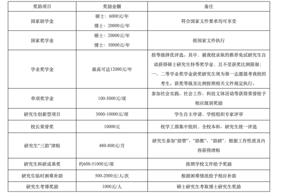 注:表中各类奖助学金仅面向全日制脱产方式学习的非定向硕士研究生评选,评选细则以学校相关文件及通知为准。