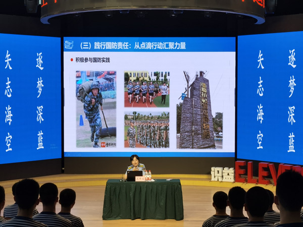 在航模飞行的同时,大家的目光被一旁的训练场吸引。只见学生们在体能训练区有序地进行日常体能训练。一名学生身手矫健地攀爬着训练架,旁边的同学整齐列队,眼神专注地观摩学习,不时交流几句。同学们还分享,在学校的学习涵盖了航空理论与体能训练等多个方面。之后,师生们聆听了由空军工程大学王教授主讲的国防教育讲座。讲座围绕国防历史、当下强军成果展开,并激励青年担当国防责任,点燃青春报国之志,让大家对国防有了更深刻的认识。