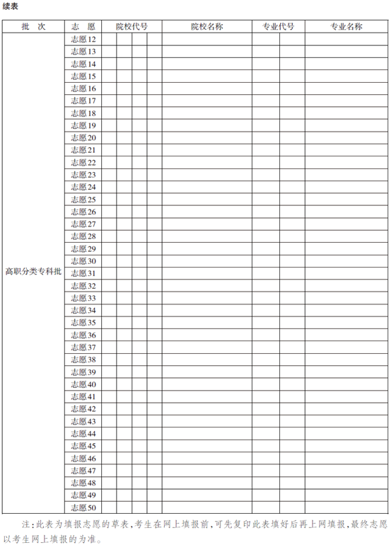 答:下表就是普高类考生的志愿草表,考生在网上填报前,可先打印此表填好后再上网填报,最终志愿以考生网上填报的为准。