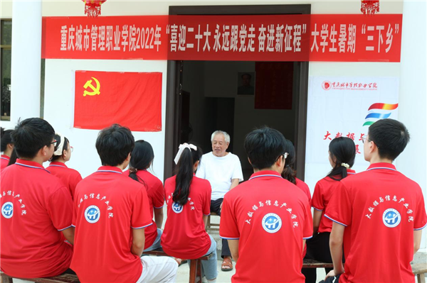 党旗辉映展现峥嵘岁月,薪火相传弘扬建党精神;过硬本领彰显使命担当,踏实脚步书写青春华章。在中国共产党成立101周年之际,为引导青年大学生在实践中服务人民、奉献社会、报效祖国,来自重庆城市管理职业学院大数据与信息产业学院10余名师生,组成了“喜迎二十大 永远跟党走 奋进新征程”大学生暑期“三下乡”社会实践团,赴重庆市丰都县上了一堂特殊的党课,通过邀请老党员开展红色主题宣讲、法治教育宣传、体验农村生活等活动,进一步引导大学生心怀“国之大者”,奋力“走在前列”,以昂扬的奋斗姿态迎接党的二十大召开。