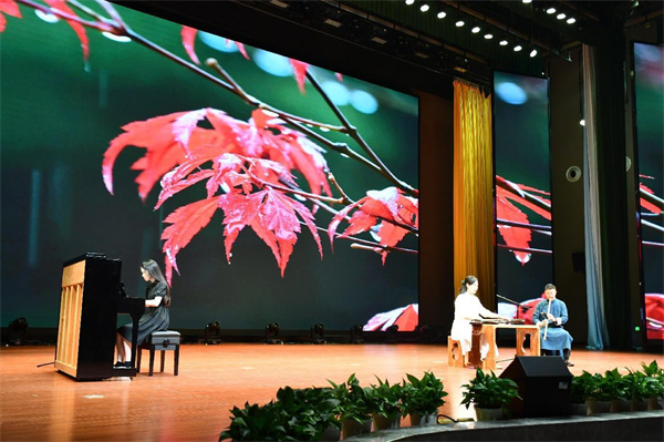 演出现场,千年古琴“空谷传声”惊艳亮相,青年古琴演奏家金润一领衔“琴润一生”民乐团奏响非遗古琴,为全院师生们带来了一场古色古香、意境满满的视听盛宴。在《半山听雨》曲目演奏中,古琴名家、洞箫名家更是与重庆中医药学院的学生代表一起,以古琴、钢琴、洞箫合奏的形式,为大家带来了一场跨越古典与现代、跨越东方与西方的酣畅淋漓的合奏表演。