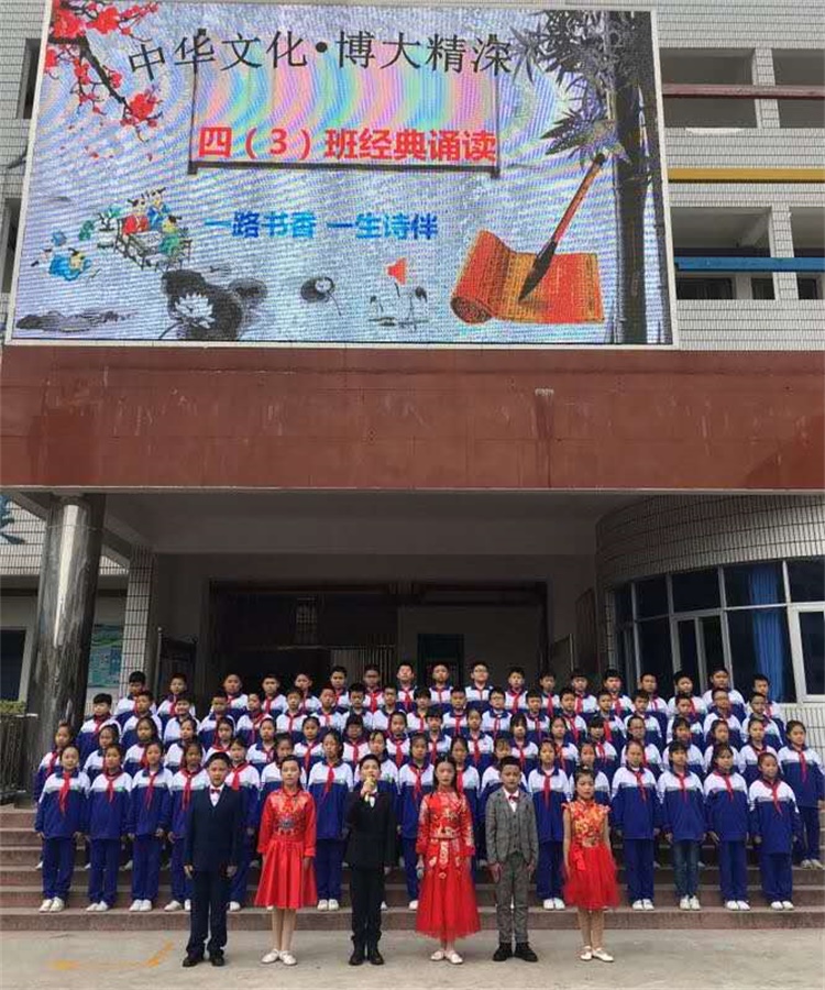 “用唱诵、讲故事、诵读比赛等丰富多彩的形式,让孩子们从小懂得家国情怀、做人道理。 成长的快乐莫过于书香相伴,故此我校每周二大课间经典诵读展示已成常态。” 蔡干校长说。