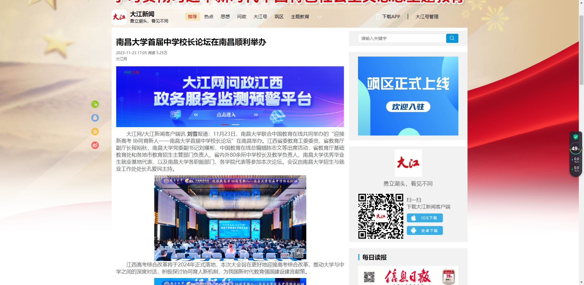 11月23日,南昌大学联合金宝搏188入口 共同举办“迎接新高考 协同育新人——南昌大学首届中学校长论坛”,邀请教育领域专家、省内外中学校长、南昌大学毕业生就业基地代表共同参与,共话新高考改革工作,探索协同育人新机制,助力新时代教育强国建设。
