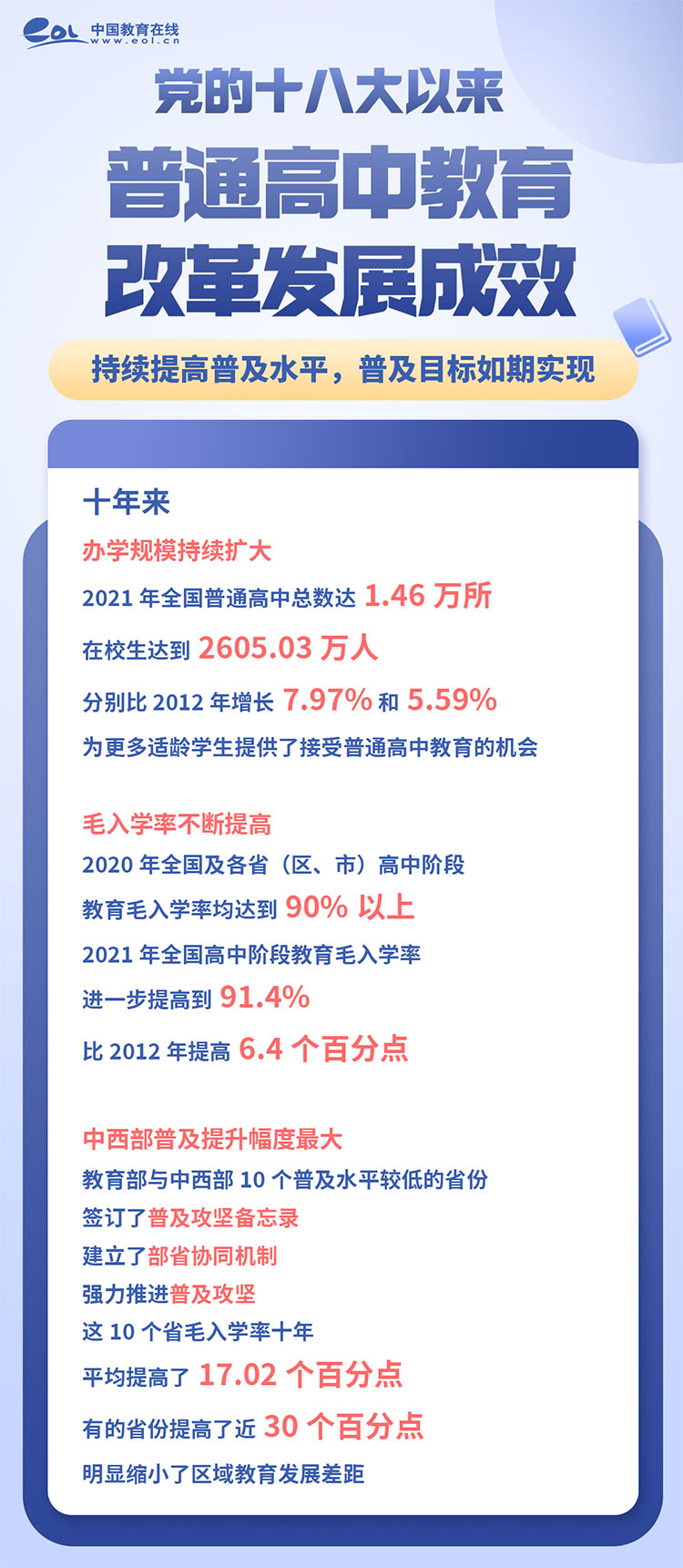 2021年,全国高中阶段教育毛入学率进一步提高到91.4%,比2012年提高6.4个百分点……详细