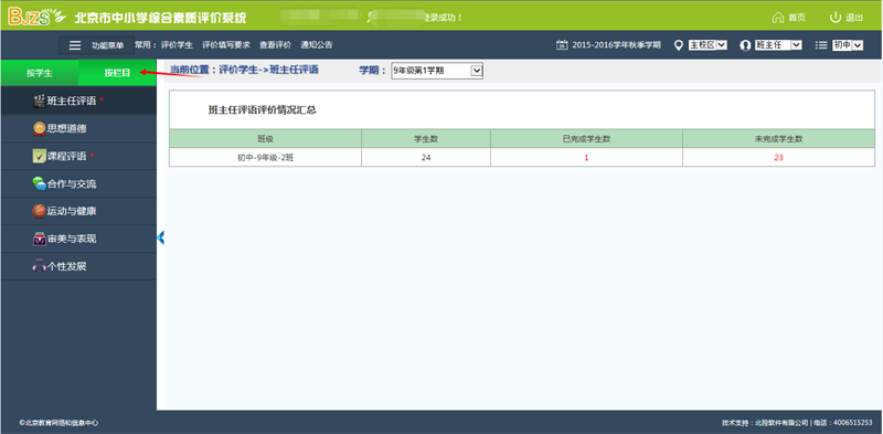 点击“按栏目”按钮,选择需要查看的栏目,点击班级,即可查看该班级所有学生与该栏目有关的评价情况,如下图所示:
