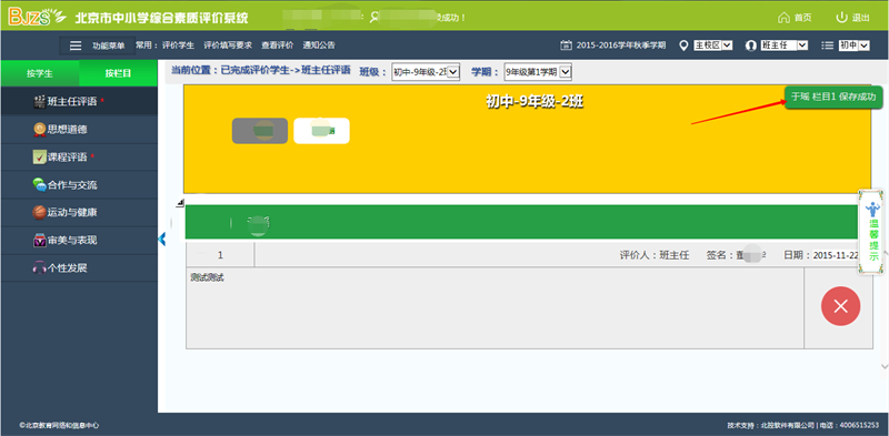 展开该班级树状图,选择需要评价的学生,进入增加页面,点击需要新增的评价内容框(内容框背景变白),填写评价内容,填写完成后,鼠标点击评价内容框以外区域,自动保存评价内容,并弹出提示框。如下图所示: