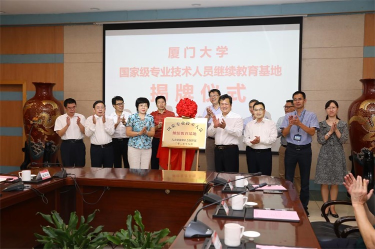 10月20日,厦门大学国家级专业技术人员继续教育基地揭牌仪式在颂恩楼举行。福建省人力资源与社会保障厅党组成员、副厅长洪长春,厦门大学党委常委、副校长邓朝晖,福建省人社厅职业能力建设处处长刘思一,学校继续教育管理委员会成员、有关职能部门负责人及继续教育学院党政领导出席揭牌仪式。仪式由继续教育学院院长夏侯建兵主持。