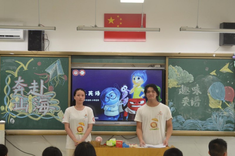 图为实践队队员杨洁 李泓伟讲解“趣味英语”