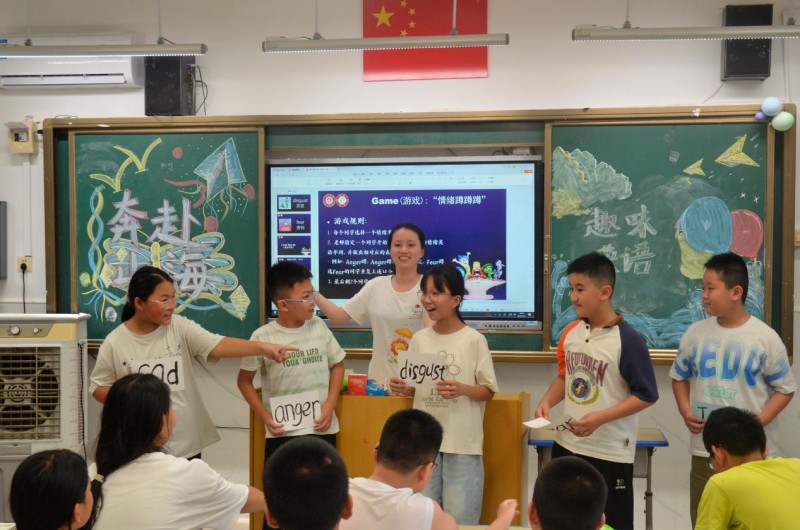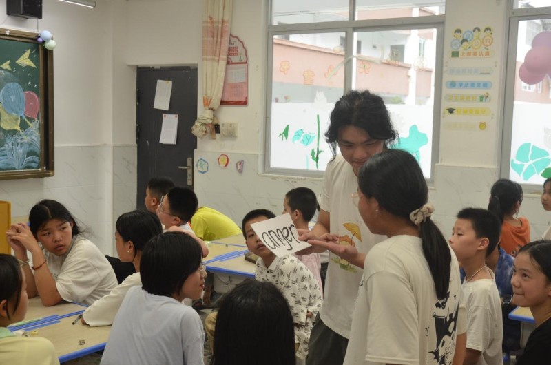 实践队创新英语教学模式,推出“双维度”趣味课堂。情绪主题课依托动画电影《头脑特工队》,通过“情绪词汇学习—电影片段配音—直播式小组展示”链条,引导学生用“Happy”、“Anger”等词汇表达演绎角色情感。