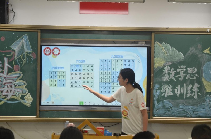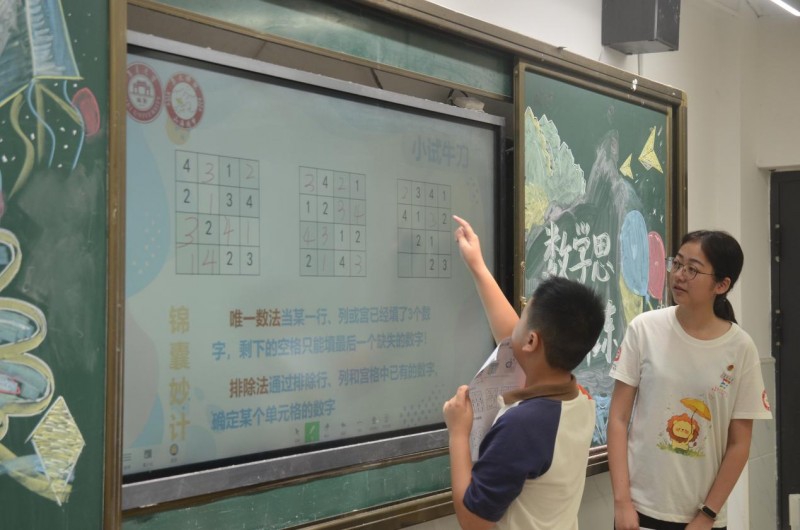 小组数独擂台赛将学习推向高潮——孩子们紧盯白板上的动态题目,协作推理、争分夺秒,教室里回荡着“这一列缺数字3!”的兴奋呼喊。实践队队员林嘉怡观察到:“有孩子起初因难题焦躁挠头,但在实践队队员的提示下解出答案时,眼里的光比获奖还亮。这就是思维破茧的瞬间。”