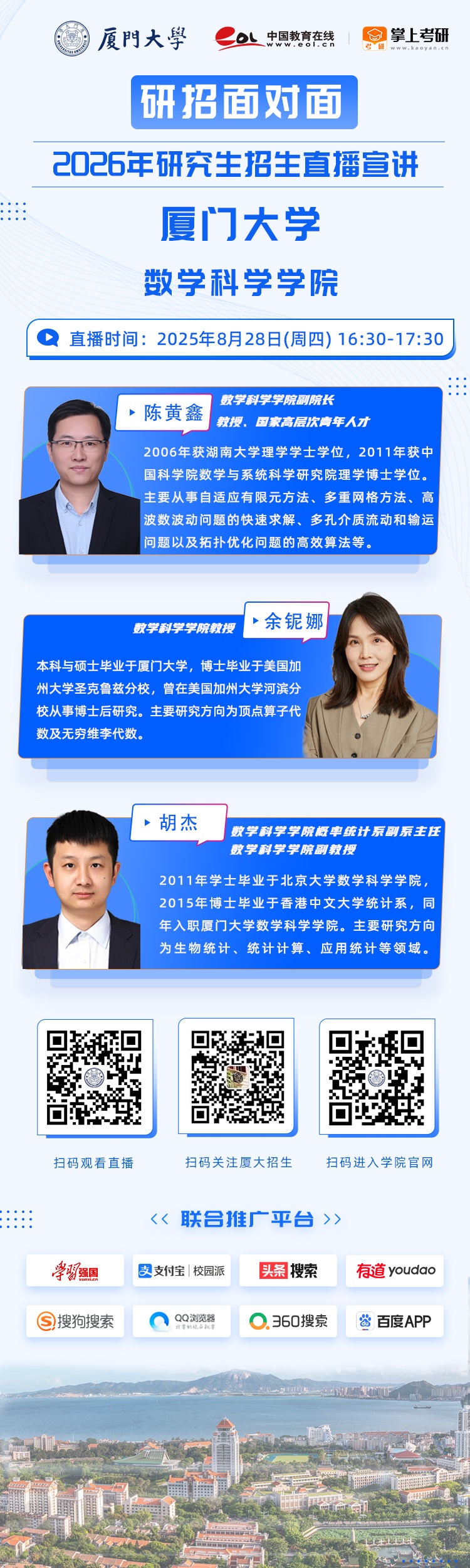直播预告|8月28日,2026年厦门大学·数学科学学院研究生招生直播咨询会开讲