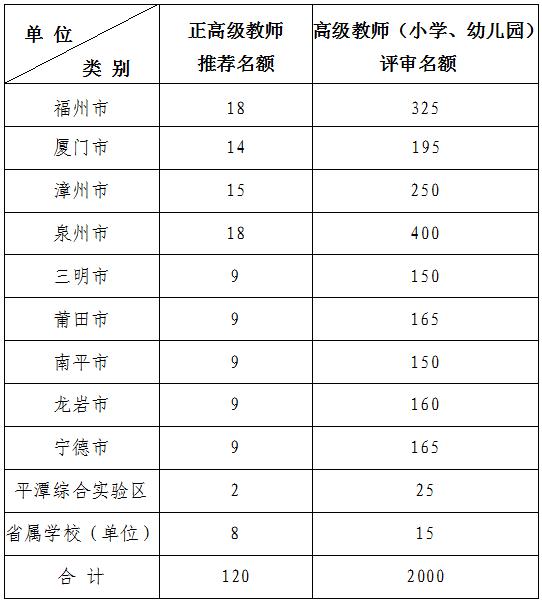 正高级教师、高级教师(小学、幼儿园)推荐名额
