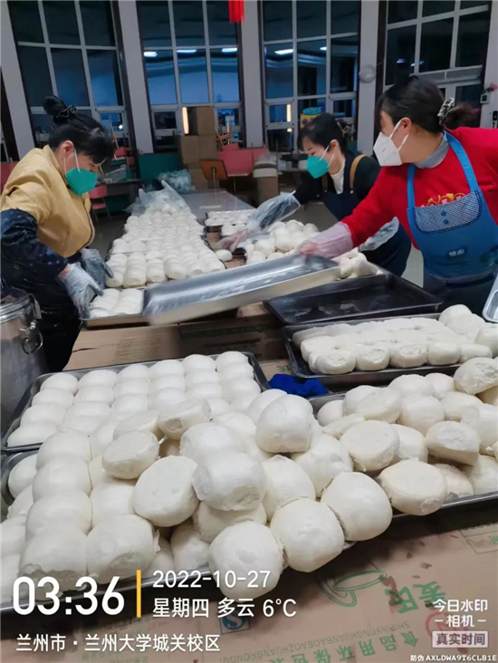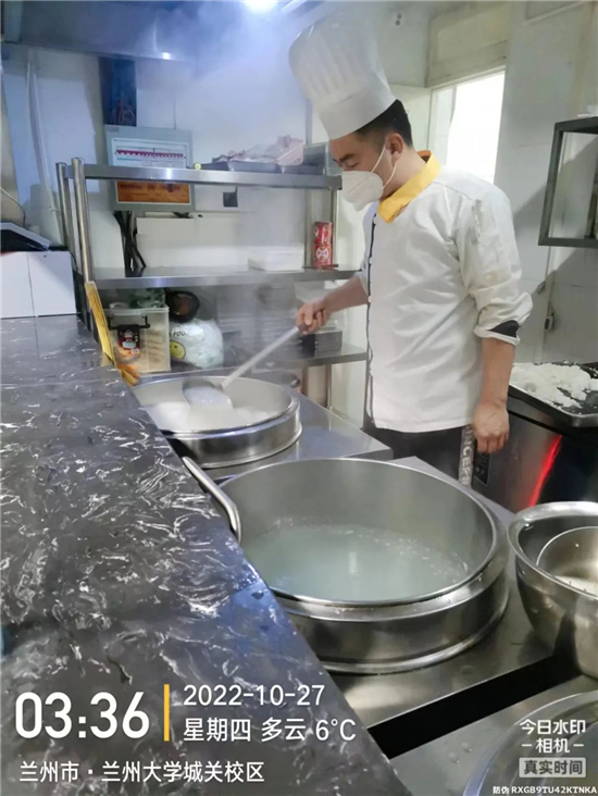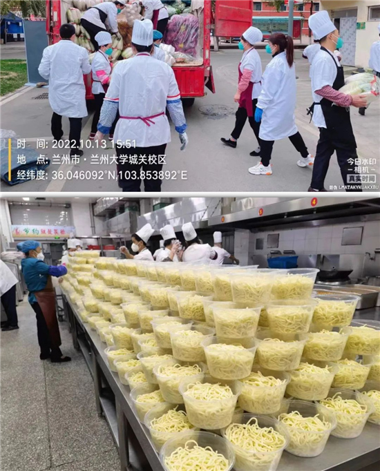 为保障城关校区东西两区广大师生的用餐需求,学校调配榆中校区教工餐厅厨师长刘志鹏带领20名员工赴东区新竹苑食堂工作,由于没有宿舍员工们只能在餐厅大堂打地铺。西区丹桂苑食堂大厅、会议室、办公室的角角落落里也住着不少员工,他们的工作与生活都集中在食堂楼内,全力保障校内师生们的一日三餐构成了他们的全部。