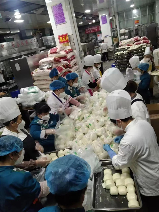 凌晨3点多,睡在食堂大厅的员工们陆续起身。各个食堂的后厨、大厅逐渐忙碌起来分装馒头、熬煮米粥、配送餐食,为早上7点30分前能够按时配送早餐作准备。