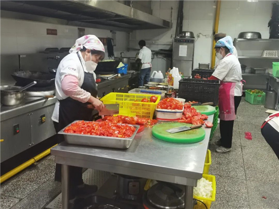 早餐工作结束,稍作休息后,员工们立即开始清洗切配蔬菜准备午餐加工。