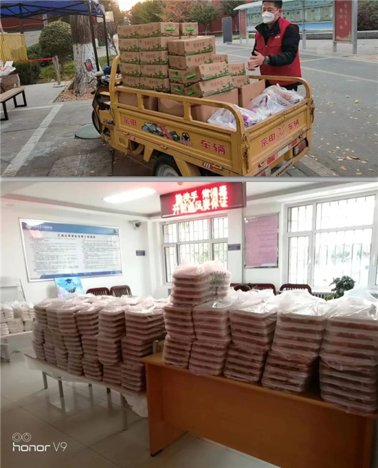 食堂员工与志愿者们齐心合力完成的一份份午餐,经过一连串的流水工作,通过各种各样的交通工具终于能及时送到师生手中。