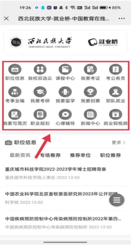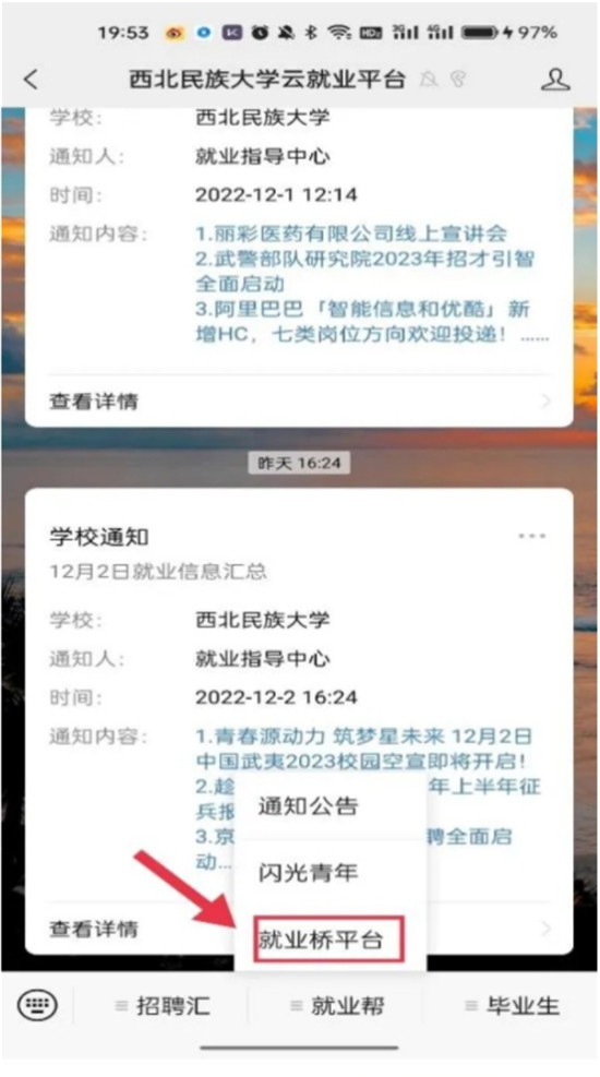 关注“西北民族大学云就业平台”微信公众号,点击底部菜单栏“就业帮”,选择“就业桥平台”,即可查看相关模块及最新资讯。