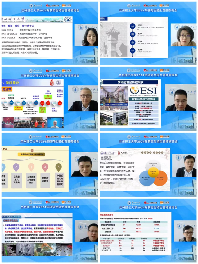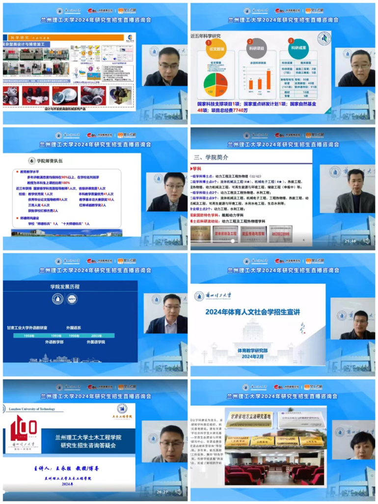 2024年3月16日,兰州理工大学2024年研究生招生调剂直播宣讲会顺利进行,来自兰州理工大学机电工程学院、计算机与通信学院、经济管理学院等16个二级学院的教授、招生负责人云集直播间,详细介绍了兰州理工大学的发展形势、地理位置、师资力量、科研平台、就业深造、考生待遇等考生报考关注的内容、为报考兰州理工大学考生答疑解惑。