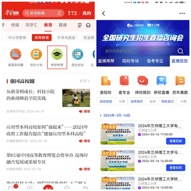 二、进入学习强国,选择教育类-188金宝搏beat官网登录 -考研考博,点击2024研究生招生直播,选择兰州理工大学。