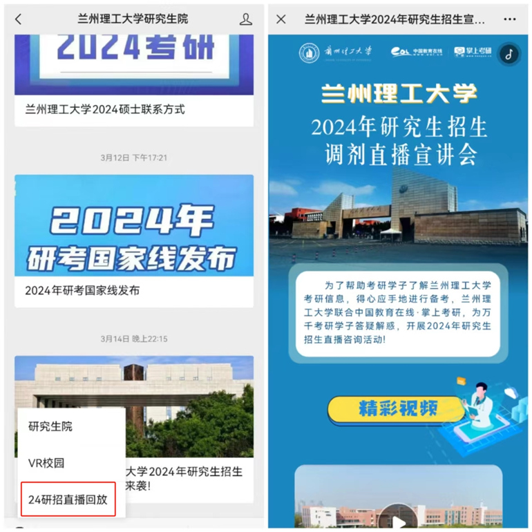 一、关注兰州理工大学研究生院公众号,点击2024年研招直播回放,进入专题页面。