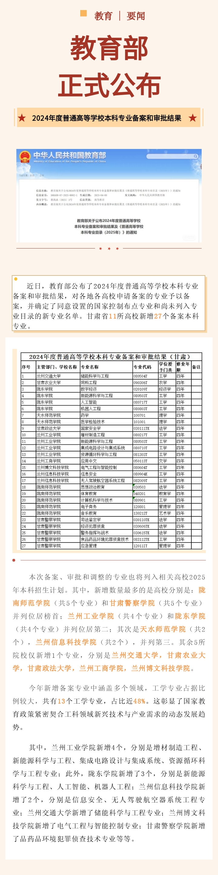 正式公布2024年度本科专业备案审批结果,甘肃省新增27个本科专业