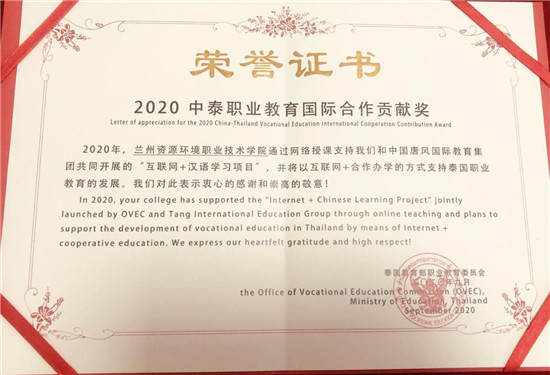 兰州资源环境职业技术学院荣获中泰职教国际合作突出贡献奖