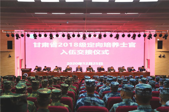 12月25日,伴随着嘹亮的军歌,甘肃省2018级定向培养士官入伍交接仪式在兰州资源环境学院图书馆报告厅隆重举行。834名定向培养士官胸戴红花,昂首阔步迈入绿色军营,正式成为共和国的一名军人。省征兵办公室主任、省军区动员局局长宋春林,省教育工委委员、省教育厅党组成员、副厅长张国珍,学院党委书记、院长郑绍忠,兰州警备区、城关区人武部、陆军、海军、空军、火箭军、战略支援部队、甘肃武警总队,学院相关领导、处室负责人及部分士官生代表出席会议。学院党委委员、副院长宋元文主持。